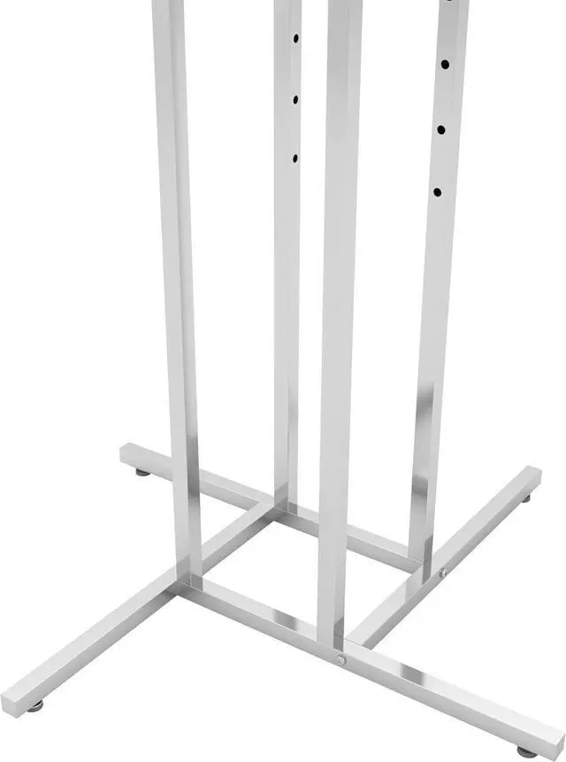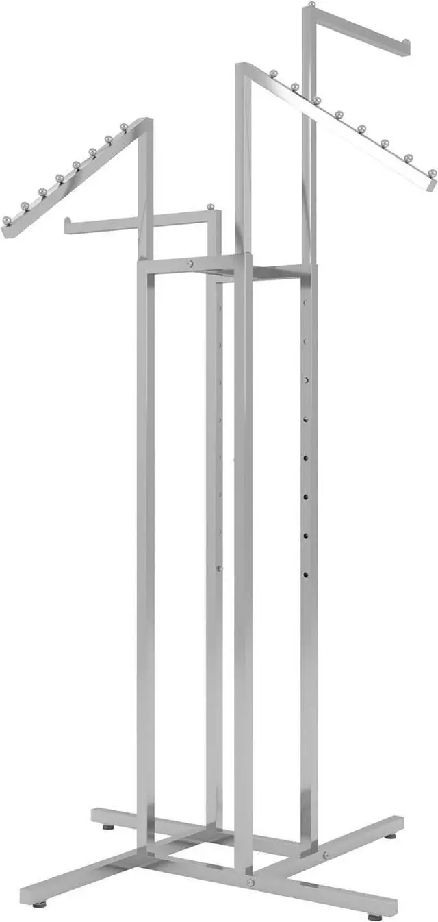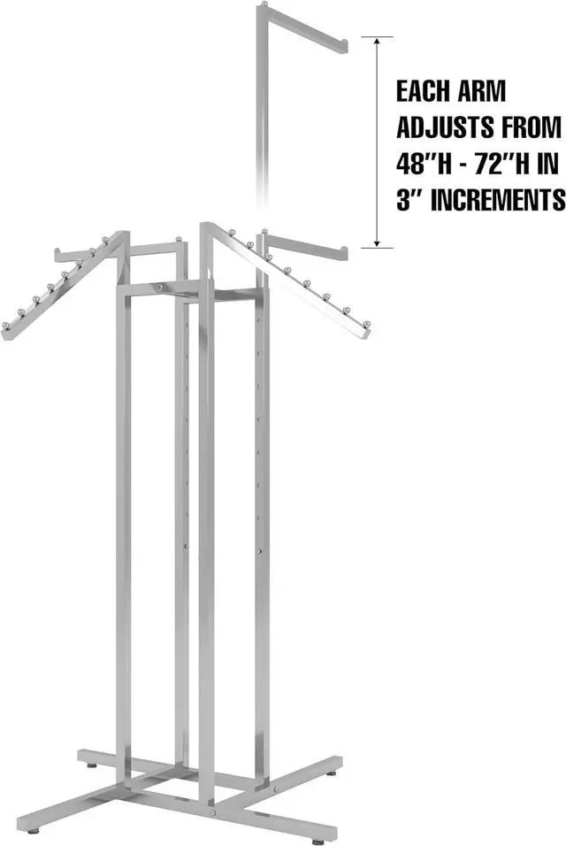 ADJUSTABLE: On this 4-way clothing rack there are two straight arms and two slanted arms adjustable every 3 from 48 to 72. All the arms on this clothing store rack are adjustable allowing you to accomadate the arms to the best fit for all clothing.