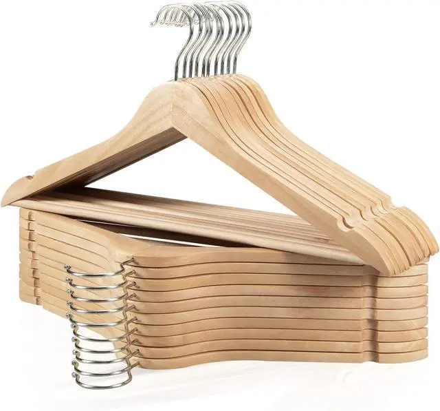 Perfect Notches Shape & 360 Degree Swivel Hook: Notches on both side shoulders of wooden coat hangers can be used to hang your tank tops, dresses, bras etc. What' s more, you can hang or take clothes at any angle in the closet with 360-degree swivel chrome anti-rust hook design.