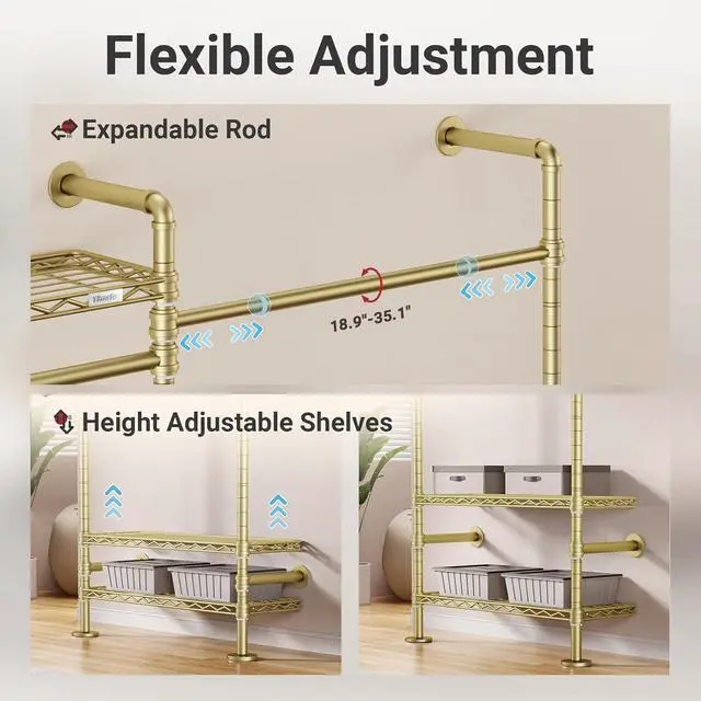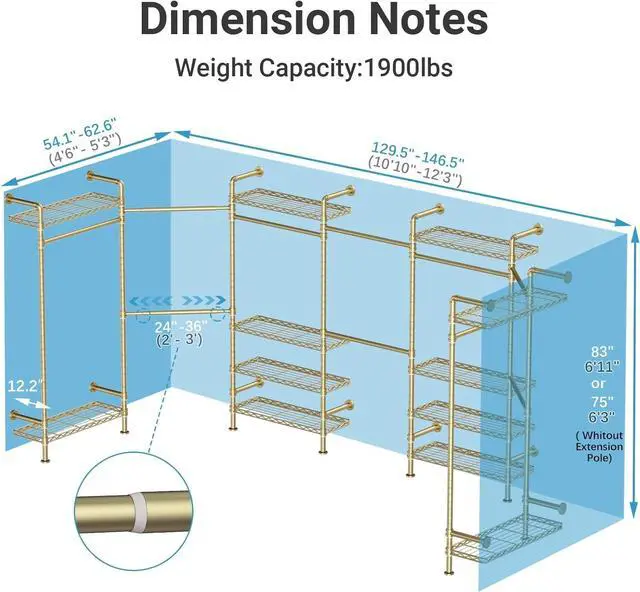 Space Saving -- Wall-mounted garment rack closet systems with top shelves and bottom space providing an integrated solution for you to maximize storage in a confined space. (Dimension of wall pipe clothing rack size: 129.5 " - 146.5 " x 54.1 " - 62.6 " x 75 " -83 ", Depth: 12.2 ).