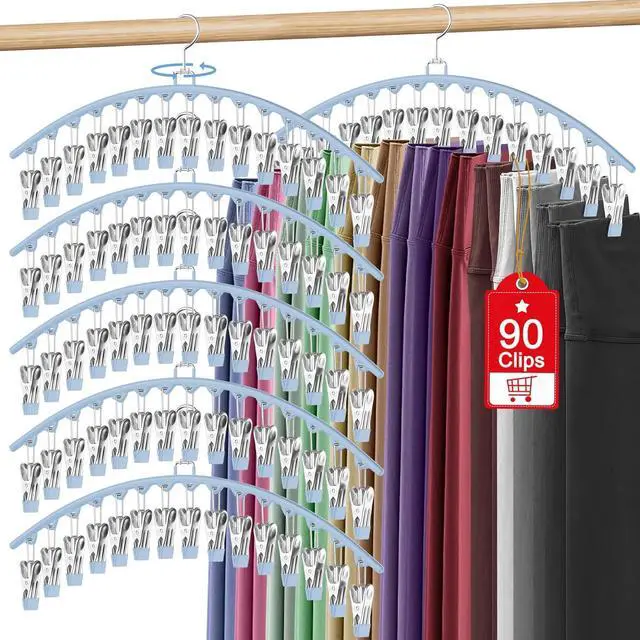Upgraded Large Capacity: Each yoga pants hangers space saving come with 15 large clips and 360°rotating hook; A set of 6 legging hangers space saving can easily hold up to 90 pairs of yoga pants; Saving you at least 80% storage space and keeps your closet tidy; The hangers for pants is great for small closets; apartments; and dorms