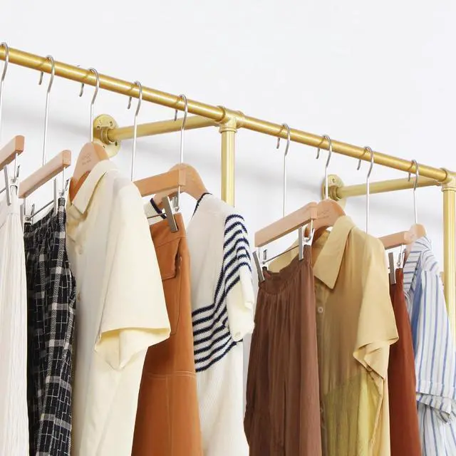 Functional: The WJJAYY Wall Mounted Gold industrial pipe clothing rack combines style and functionality to enhance your space. The sleek T-bar design with a Nano Gold finish adds a touch of elegance, making it a perfect addition to any home or retail setting. Its heavy-duty construction ensures durability, allowing you to securely hang and organize your garments.