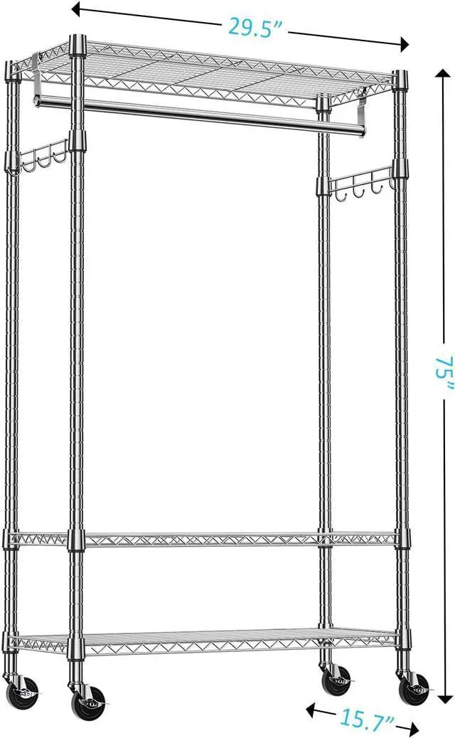 IZEUK Heavy Duty Rolling Garment Rack with 3 Adjustable Wire Shelves, Hanging Rod & Side Hooks - Mobile Clothes Rack with Wheels, 29.5" W x 15.7" D x 75" H,Chrome
