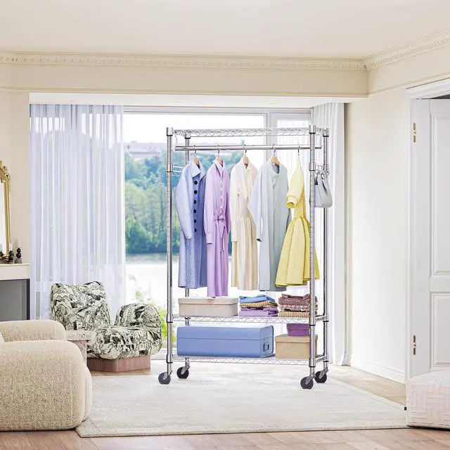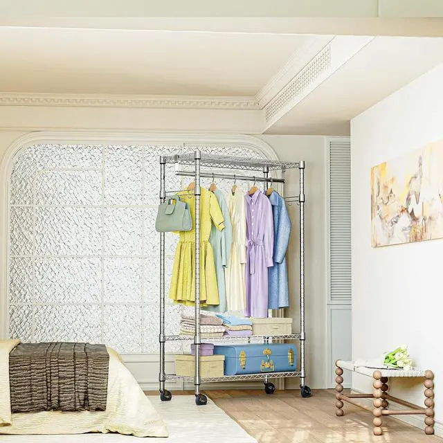 Spacious Adjustable Storage Features 3 adjustable wire shelves, a sturdy hanging rod, and side hooks, allowing you to customize storage for clothes, shoes, bags, and more.
