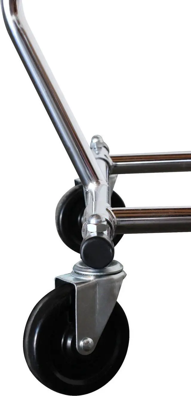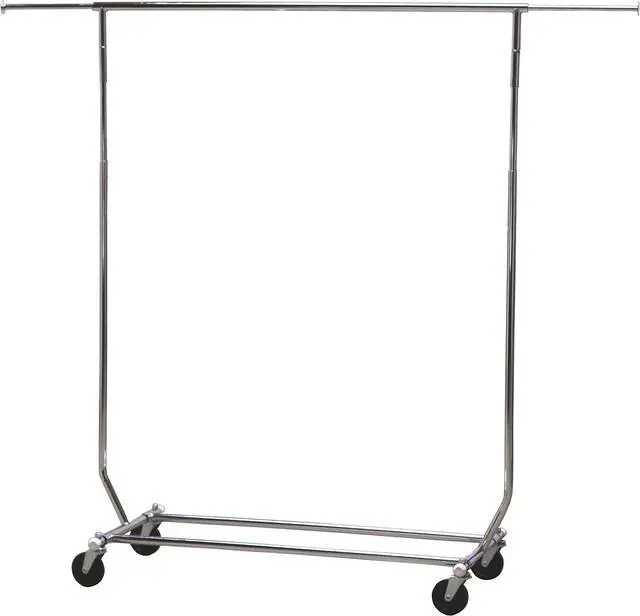 Nullify Imported Commercial Grade - 250 Pound Load Capacity Heavy Duty Steel, Chrome finish Four heavy duty 4" casters Extensible Horizontal Rod from 51' ' to 75' ' Dimension: 51' ' L x 22' ' W x 60' ' H