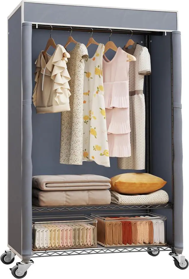 Adjustable Shelves & Dustproof Cover: Features 3 hight adjustable wire shelves, detachable hanging rods and zippered oxford fabric dustproof cover, this wardrobe closet providing versatile storage organizer. The clothing rack can be DIY, maximizing your storage space for shoes, bedding, hanging clothing, and folded clothes as a coat rack.