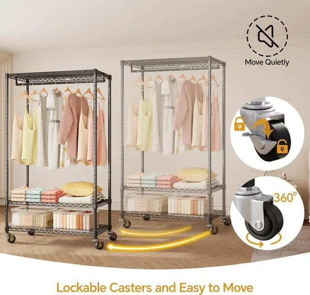 360° Universal Wheels: This hanging clothes rack equipped with 4 rotatable wheels, including 2 lockable wheels, it is easy to move around on wheels, allowing for mobility and stability throughout different rooms of your home.