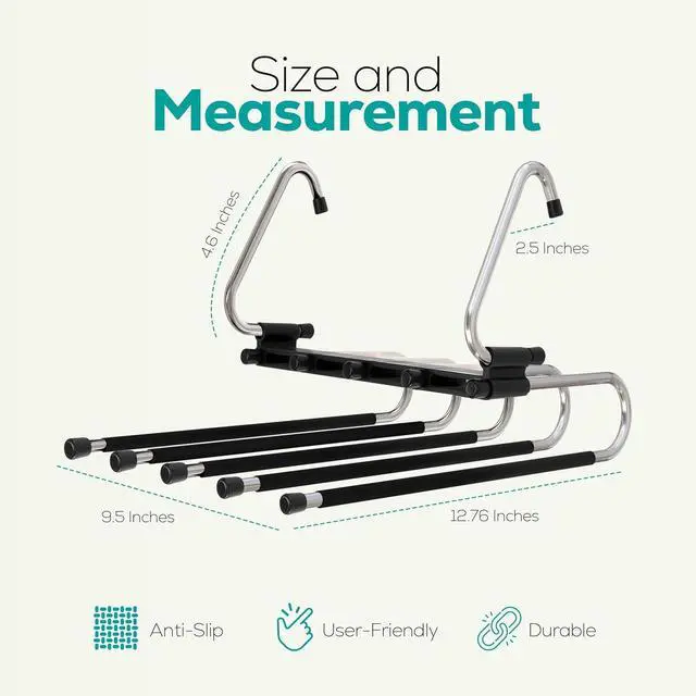 The 5-tier Pants hanger measures 12.76 × 9.51 inches with 2 hook Pipes and 1.94 -inch space between each hanger. Ergonomically designed to preserve garment shape and save closet space.