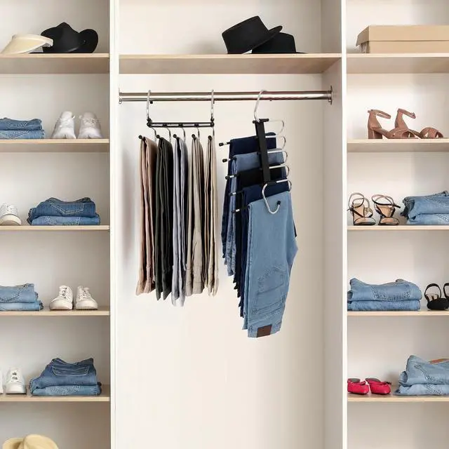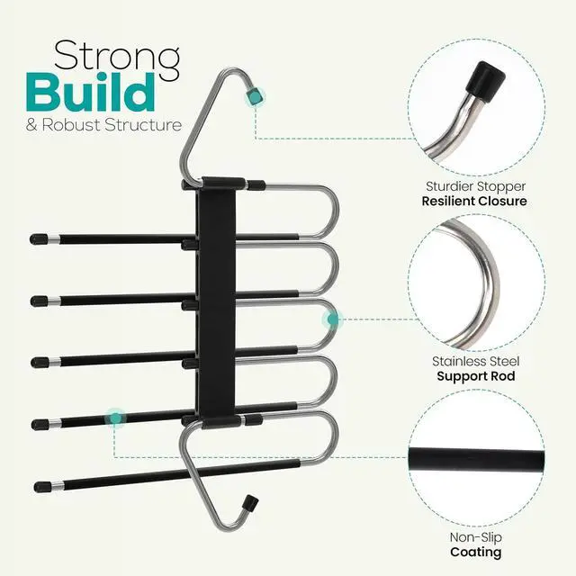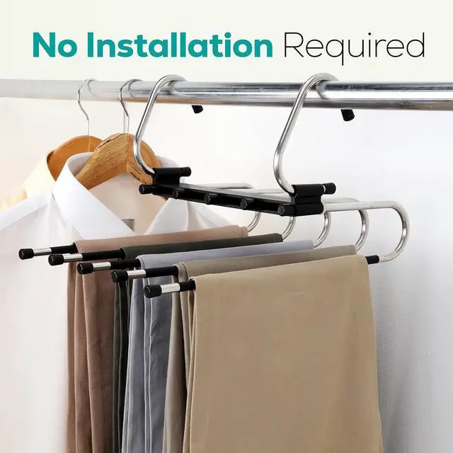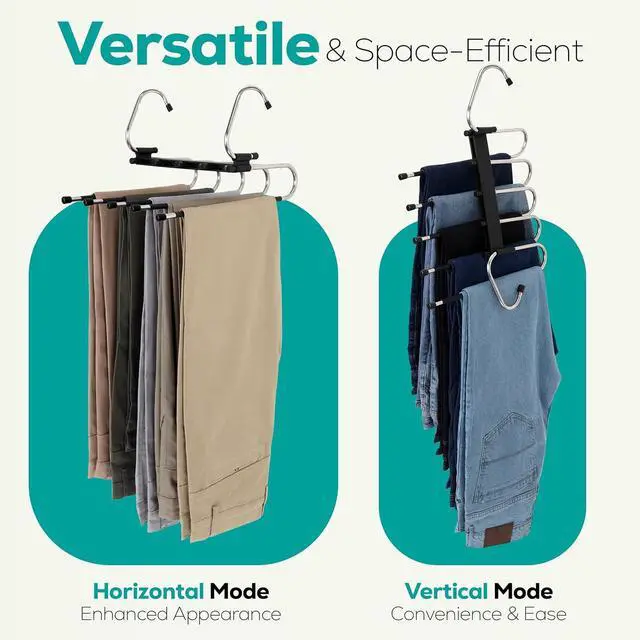 Multifunctional pant hangers - Suitable for all kinds of clothes, perfect for pants scarf, and skirts. Each hanger can easily hold up to 5 jeans, chinos, or other clothing.
