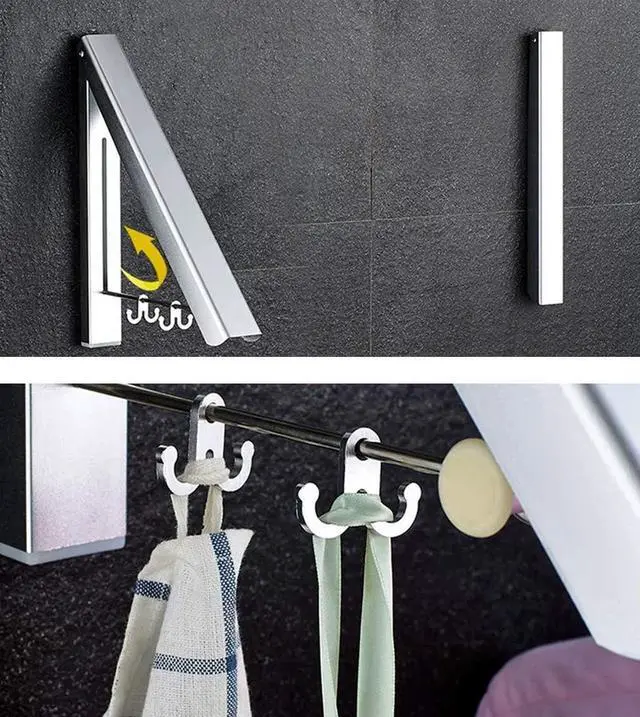 RETRACTABLE & FOLDINGEasy to open and easy to fold away. When you open the coat wall rack, it can gives you about 10 inches of space to hang clothes. When the rack is closed its dimensions are very compact and sleek-looking, and you can open it when your guests arrive. Finally you can call lot of friends for a party and test your new foldable coat rack