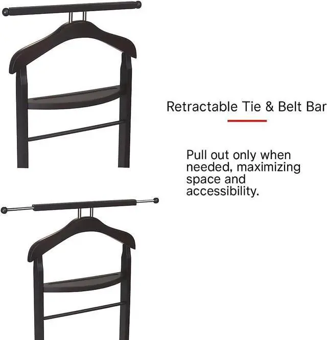 Extractable Tie Bars A stylish and functional extractable tie bar, designed to hold your ties and belts with ease. The tie bar is carefully crafted to provide a secure and sturdy hold for your ties and belts, keeping them wrinkle-free and well-maintained. This functional and stylish feature adds a touch of sophistication to the valet stand, making it an elegant and stylish addition to any home or office interior.