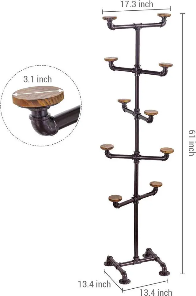 Multifunctional pipe style rods of this hat tree can be used to hang hook handled umbrellas, scarves, purses, and totes; also use as a clothing valet to store coats, jackets, and more on the circular wood platforms
