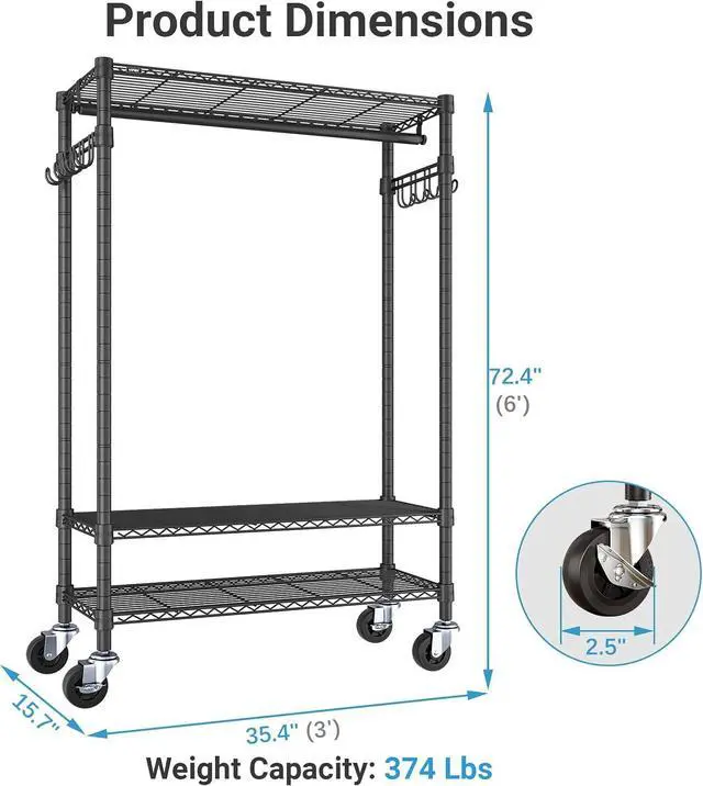 Heavy Duty & High Weight Capacity The Garment Rack is built with durable carbon steel, supporting a max load of 374lbs. Offering ample storage space for heavy-duty storage of clothes, shoes, accessories, or other household items, ensuring long-lasting stability and reliability