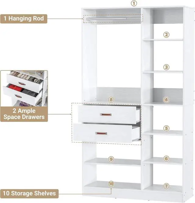 Closet Organizer System with 10 Storage Shelves - This 40 Inches closet system has 10 storage shelves, 1 hanging rod, and 2 wood storage drawers that can store all your storage things. It has 250+ pcs clothes capacity, this 4ft heavy-duty wardrobe rack has a hanging rod that can hang dresses, T-shirts, suits, and jackets. You can also put your storage boxes, shoes, baskets, folded clothes, and bedding in this freestanding closet system' s shelves and drawers. You can put about 250+ pcs of summer clothes in our closet wardrobe which makes the clothes in a clean condition.