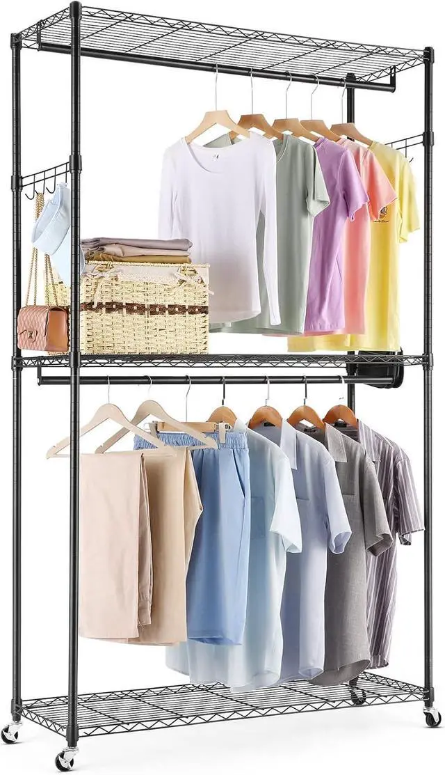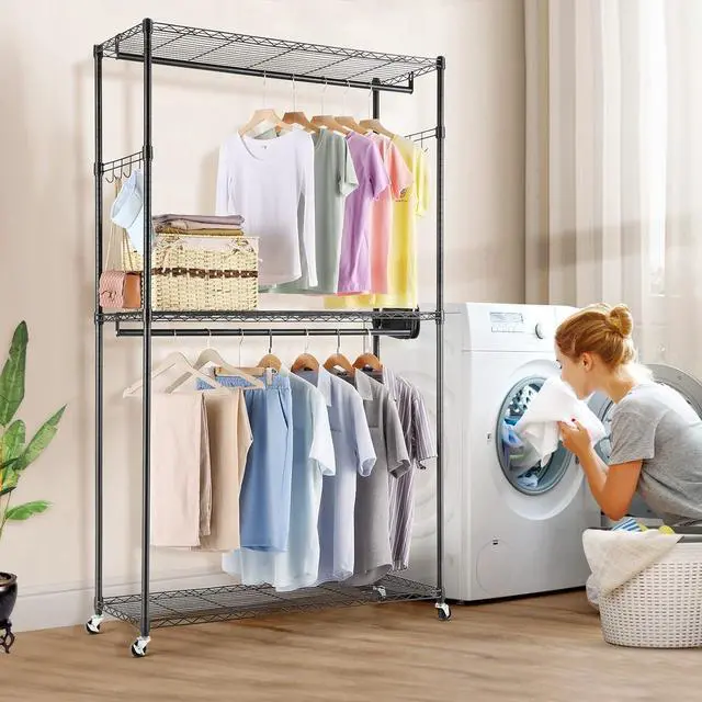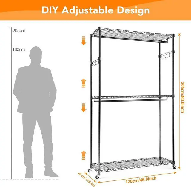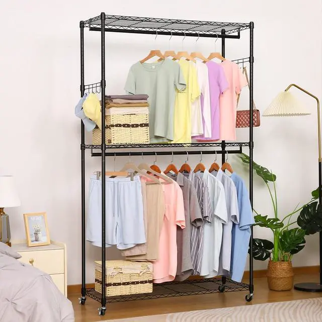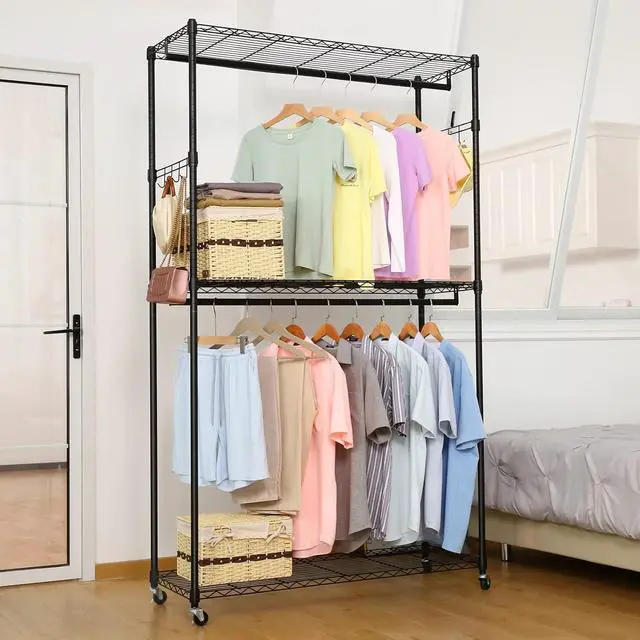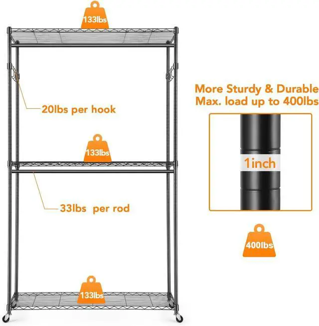 --Premium and Safe Clothes Rack: The clothing rack is heavy-duty and can hold up to 800lbs. The wire portable clothing closet is relatively light and can be easily moved after removing the clothes placed on it. Hanging clothes racks for hanging clothes are made of 1inch diameter heavy-duty metal, sturdy metal wire, and Eco-friendly and odorless paint