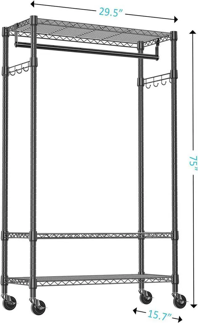 Spacious Adjustable Storage Features 3 adjustable wire shelves, a sturdy hanging rod, and side hooks, allowing you to customize storage for clothes, shoes, bags, and more.