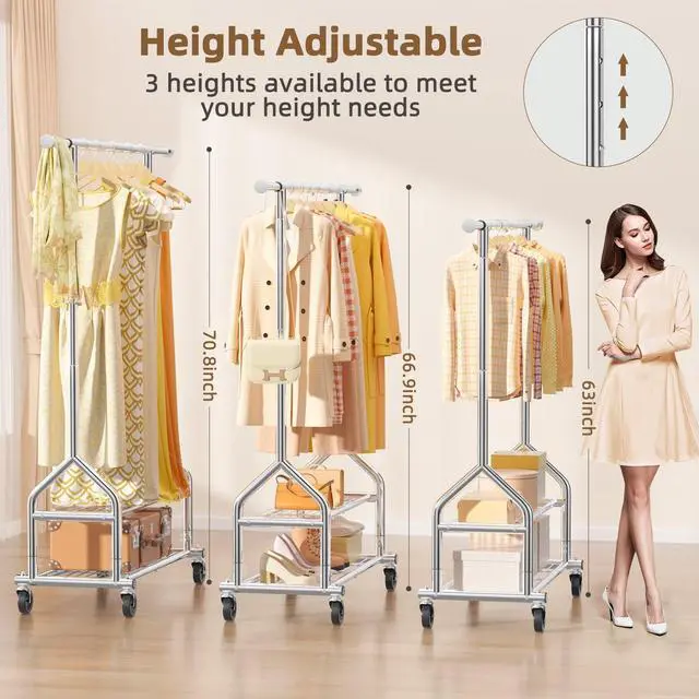 • Extendable Hanging Rod & Height-Adjustable: You can adjust height of clothing rack to fit long dresses or short garments, ensuring optimal space usage. Extend or shorten rod length to fit tight spaces or expand storage when needed.Customizable for user convenience.