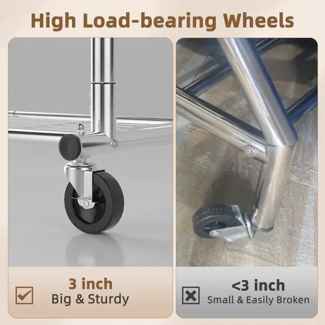 Rolling Smoothly: 3 inch heavy-duty swivel wheels glide effortlessly on floors, tiles, carpets, or concrete. Locking brakes provide stability when stationary, making it easy for you to pick up or hang clothes.