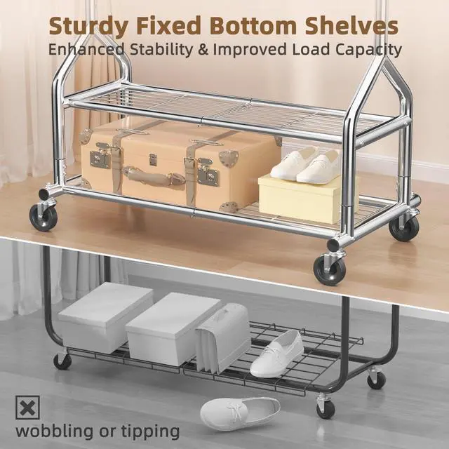 Spacious Dual Shelves & Enhanced Stability: 19.7 inch widened base and fixed shelves provide solid foundation, preventing wobbling or tipping, especially under heavy loads. The rolling clothes rack with 2 tier shelves, suitable for shoes, bins, or luggage, maximizing space efficiency.