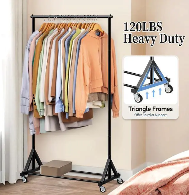 Strong & StableHeavy duty clothing rack use triangle base and metal frame to provide stronger support, 25.4 mm dia. all steel tubes, smooth welding point, make a sturdy clothing rack that holds up to 120lb load, clothes racks for hanging clothes is still not wobbly and bending when hanging heaviest garments and accessories;