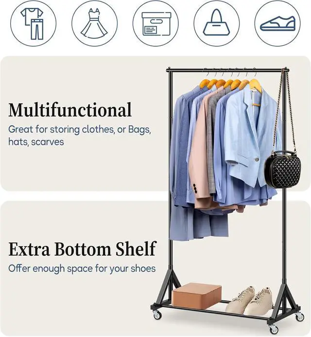 Versatile UseHanging clothes rack is perfect for your bedroom, living room, laundry room, garage, basement ect. The chrome-plated steel also allows for outdoor use, rolling rack for hanging clothes is a great solution for your yard sale, rack for clothes to hang allows you to hang types of clothes, coats, dresses, outfits, shirts, jackets etc;