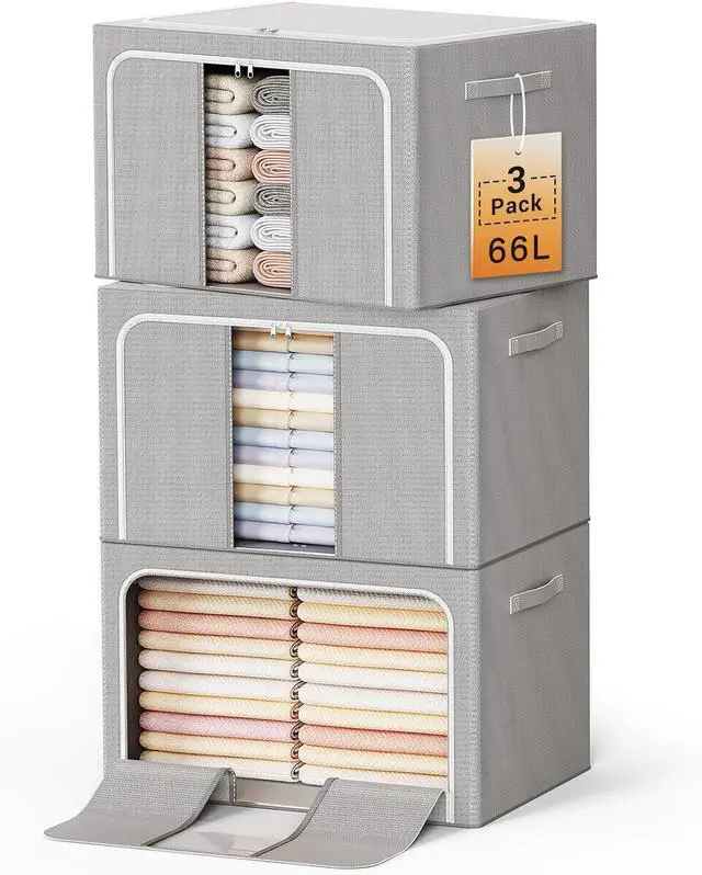 Strong And Stable Support SystemLeArex closet organizers and storage box built-in sturdy steel frame, can be neatly stacked, always keep good shape, not easy to loose and collapse. You can put our clothing storage bins above or beneath any other organization. When not in use, the closet storage bins can be folded for storage to save space. LeArex stackable storage bins have stronger load-bearing capacity than non-woven fabric storage bins.