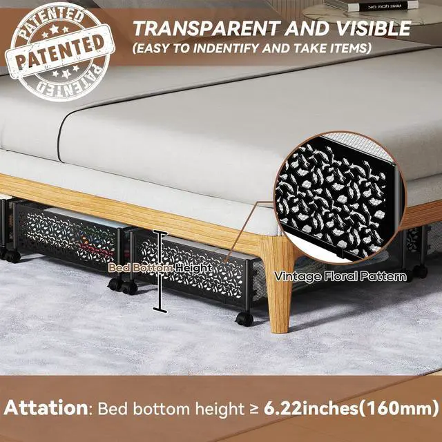 [360°Rotating Wheels] The added feature of wheels allows this under bed storager container to easily pull out for bedroom organization. Two of the 4 wheels can be locked by pushing the knob above it to fix the cart in position, the elevated design shields stored items from dust and dirt, and the unique carved floral pattern which makes you easily identify contents through the side frame even under the bed.