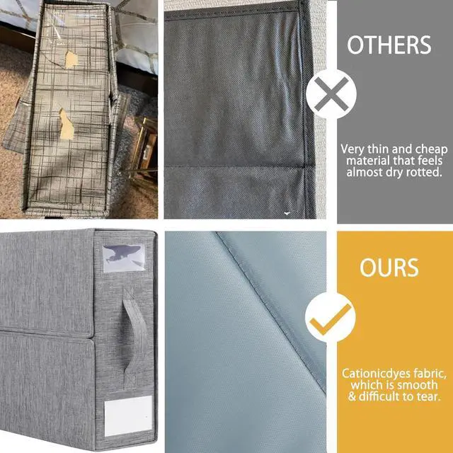 Sheets organizer size: ( 13.78 " Lx 11.81 " Wx 4.33 " H); The storage organizer Outer (Inner) material is made of 600D (210D) cationicdyes fabric, which is soft and smooth to the touch.