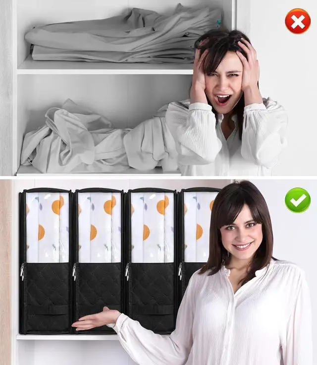4 Packs & Large CapacitySheet organizers and storage are able to fit a queen/king size sheet, 2 regular sheets or 4 king size pillow cases. Bedding organizer keep the closet organized.