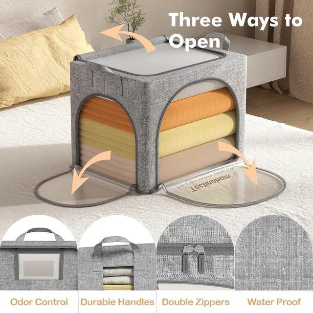 STACKABLE & FOLDABLEOur storage boxes are supported by a sturdy steel frame inside, which has a stronger load-bearing capacity than non-woven storage bags, can be stacked above and below other storage boxes without deformation, and can be folded flat when not in use to save space.