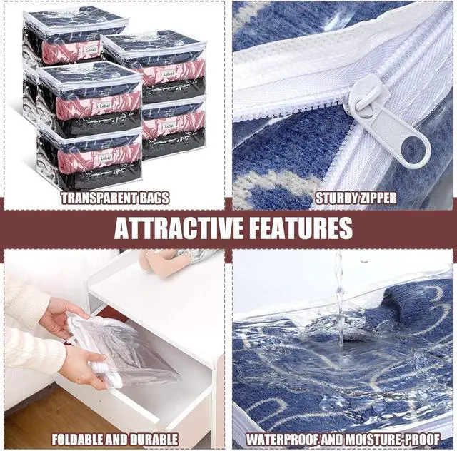 Convenient Design: the plastic blanket storage bags have side pockets for labels and clear appearance to easily identify all your stored items without opening the package, saving time and effort