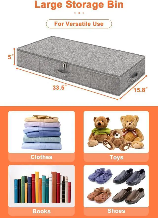 Easy Storage: With a height of just 5 inches, this under-bed storage box fits seamlessly under most couches, sofas, and dressers, making it the perfect solution for utilizing low-clearance spaces without compromising on storage capacity. The storage containers measures 33.5 ' ' long, 15.8 wide, and 5 inches tall