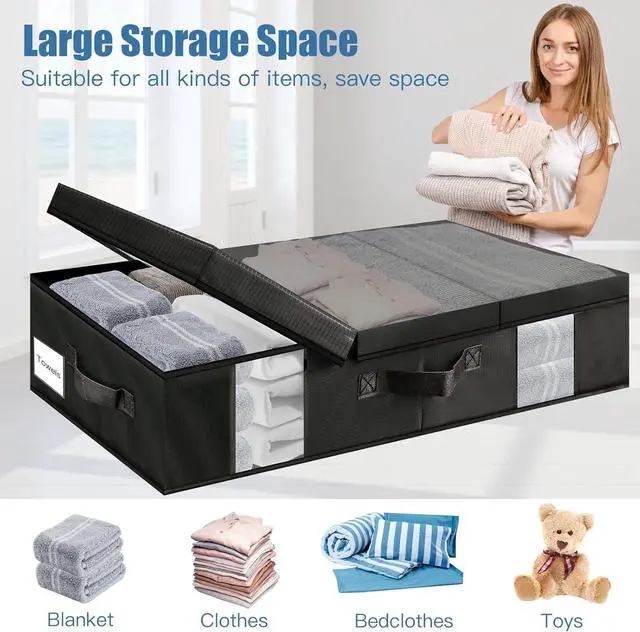 Versatility Storage Bins: From blankets and pillows to out-of-season clothes and shoes, to books and toys, these storage containers can handle all types of storage needs. Transparent Label pockets for your marking and identification. It is suitable for dormitory, attic, basement, and bedroom use.