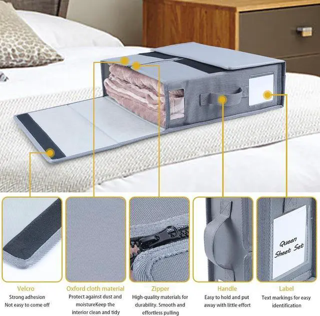 Ideal Size: Each sheet organizer opens up to 15" L x 13" W x 4.72 " H, making it perfect for fitting in linen closets, wardrobes, under the bed, and on shelves. It can perfectly accommodate 1 set of queen or king-size bed sheets, 1 duvet cover, and 2 pillowcases.
