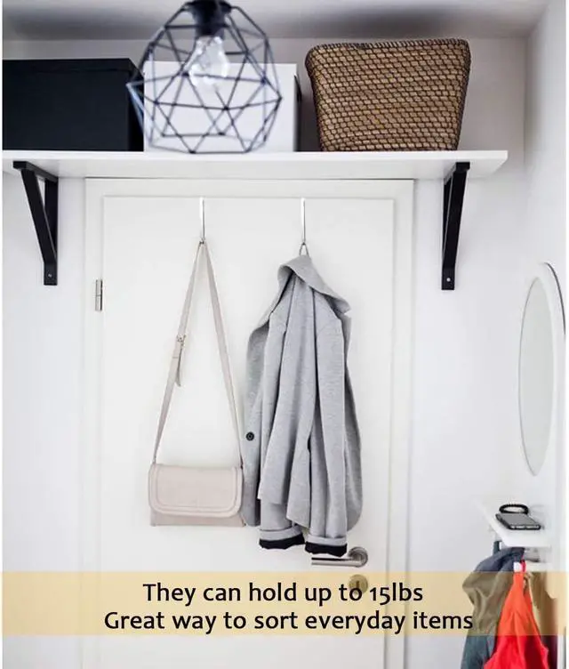 Sturdy Metal: Over door hangers made of high quality compound metal and it can hold the weight up to 15lbs. They feature upgrade design and can be tightly mounted on the door you do not worry about it moving around.