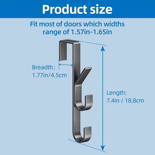 High Quality: over the door hooks are made of heavy duty metal which is durable and rust-resistant will not deform and ensure a long-lasting performance. Each hook can hold up to 20lbSize: The suitable thickness for the door is 1.57 in/4cm- 1.65 in/ 4.2 cmLength: 7.4 in / 18.8 cm