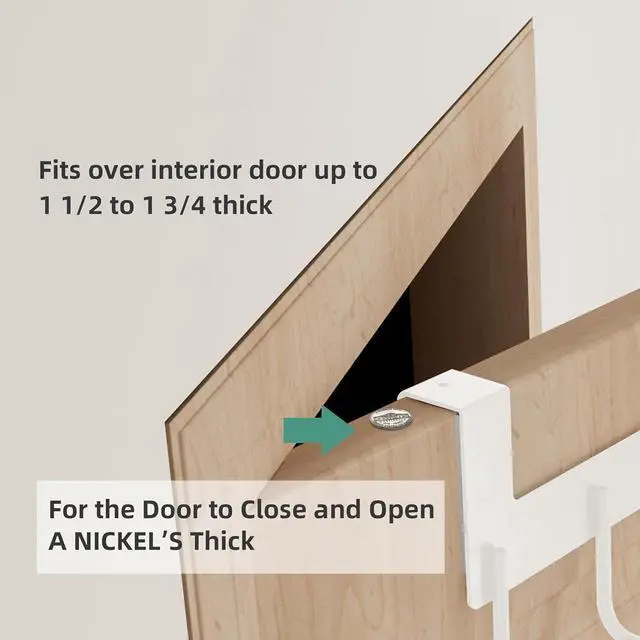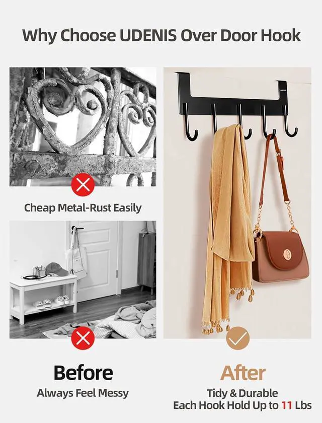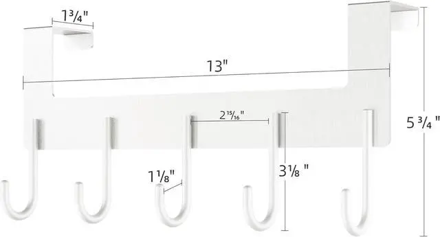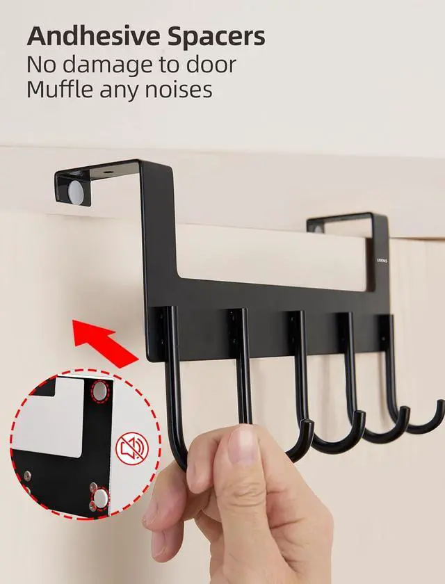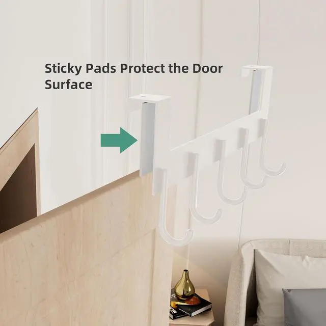 Create Extra Storage SpaceHanging on a door front or back creates additional hanging space for bathroom closet bedroom laundry garage. This over door coat rack could keep your space organized and tidyElegant & Sturdy HookIt is made of Aluminum Alloy which is durable for last used without break. Each hook can hold up to 11 pounds for heavy coat jacket backpack robe. All hooks end is nicely finished preventing your clothing from tearingHigh Quality Hooks for Damp ItemsThe cover of over door coat hanger with anodic oxidation which is anti rust healthy and environmentally friendly. Fits well for wet rain gear or towelsFunctionalThis over door hook with andhesive sponge pad stickerworks great to muffle any noises and prevent scratches to the door.