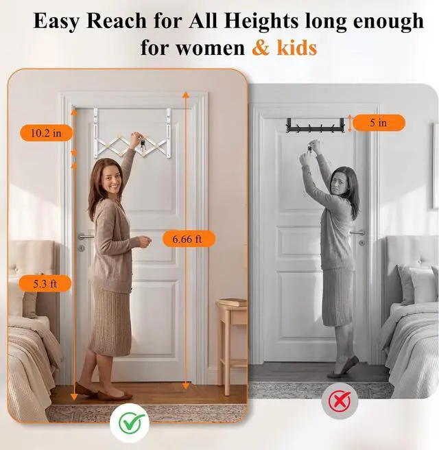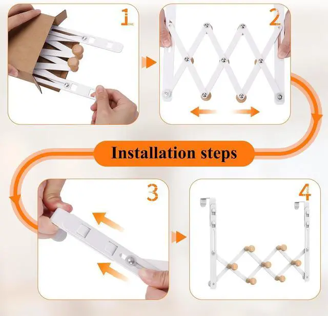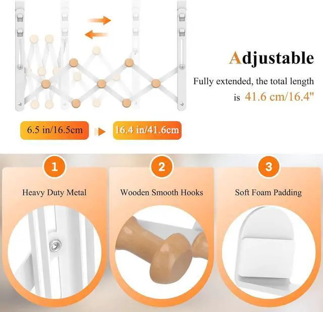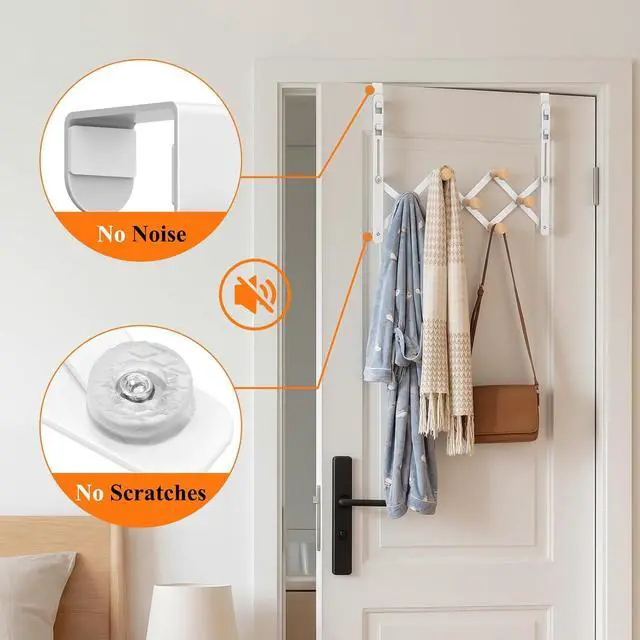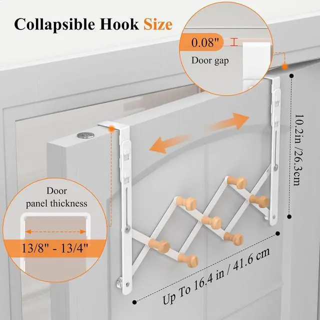 Collapsible & Travel-Ready & Space-Saving: Unlike bulky stationary racks this door organizer rack folds flat to slide easily into a suitcase or backpackperfect for bringing extra hanging space to hotels or dorms. Plus It swapped out metal hooks for seven solid wood round-hooks so your delicate travel clothes never snag or stretch. No-installation Required & Silent Pads Included: Installation was super-quick; simply snap the 2 clips onto the hook in seconds. And came with pads so it does not bang around when the door is open/closed.