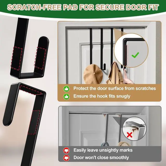 Stability: Each over the door hook comes with soft pads that safeguard your door surface from any unsightly scratches. Additionally they add friction between the hook and the door keeping the hook securely in place without slipping
