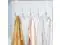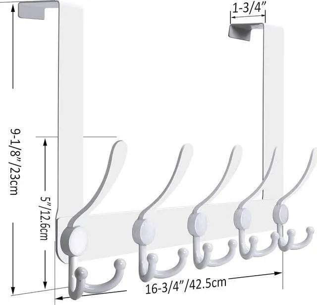Size: 16 3/4 L * 3-1/4 W * 9-1/8 H. This over the door hooks fit most doors from 1 3/8 inch to 1 3/4 inch thick. Please measure the thickness of your door first. From the top of the door to the bottom curve of the hooks is 9-1/8 inch. The over door hooks keeps your towels/clothes from falling out. White over door hook rack with 5 door hooks for hanging clothes.