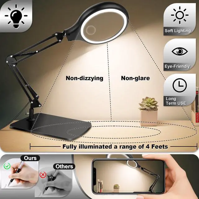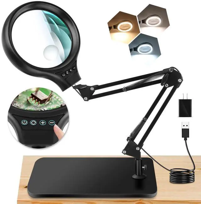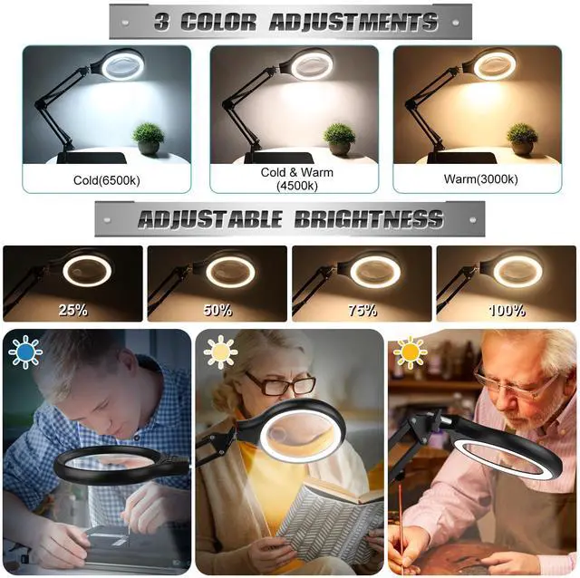 EYE-FRIENDLY ILLUMINATION: Our desk magnifier lamp's crafted for extended use. Wave farewell to tired eyes and irritation with our LED lights.Offers 3 color temps and 4 brightness levels. Includes adapter for steady. Perfect for detailed work or reading