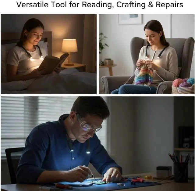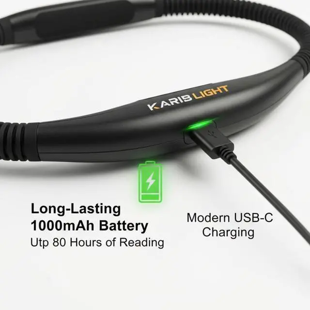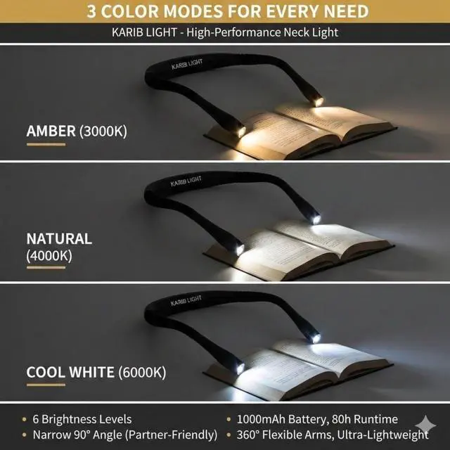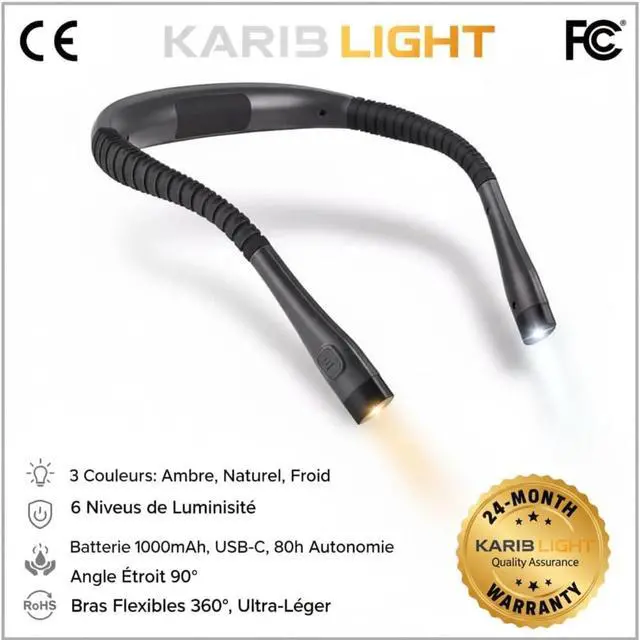 Enjoy ultimate visual comfort with the KARIBLIGHT portable reading light, designed for reading, working, or creative activities without straining your eyes. Its ergonomic, flexible, and lightweight design (only 130 g) makes it the perfect companion at home or on the go. neck reading lights for books in bed
