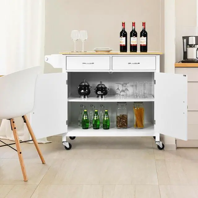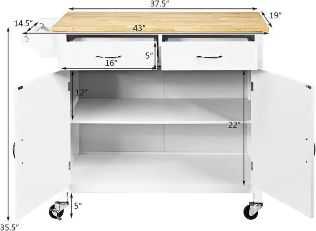 Providing extra storage space, the kitchen cart has two and a cabinet with adjustable shelf. The countertop is made of rubber wood, which measures 37.5"x19" and can bear the weight of 80 lbs. You can keep the wine or some tableware on it. The kitchen cart comes with 4 smooth universal wheels to meet your desire of moving everywhere, and 2 lockable wheels help it stop anywhere at will by just stepping on the brake. In addition, the towel rack and handle on the drawer offer more convenience and make it an effortless way to use the kitchen cart. This kitchen cart also features stylish and modern design, and it will add elegance to your house definitely. It will be the best partner whether youre cooking or treating guests.