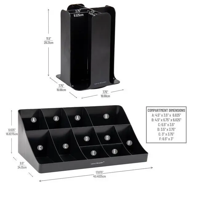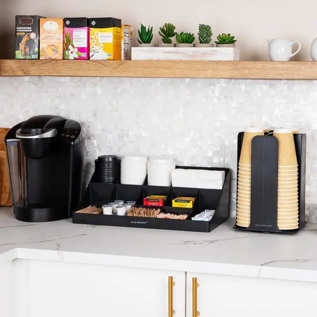 - MULTI-SLOT MAKES IT EASY TO ORGANIZE: Two tier organizer features 11 compartments for coffee cups, tea cups, cups for water, coffee lids, sugar packets, tea bags, creamers, stirrers, napkins and more - Easy stack 10oz, 12oz and 16oz cups and lids in cup tower with swivel access.