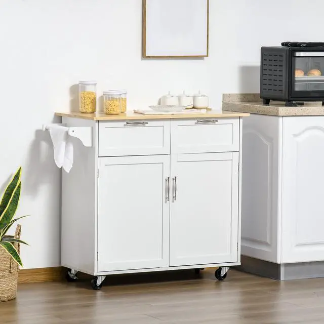 Ample Storage: This rolling kitchen island has two drawers, an enclosed cabinet and towel rack to offer a multifunctional storage solution when you have limited space in your kitchen.
