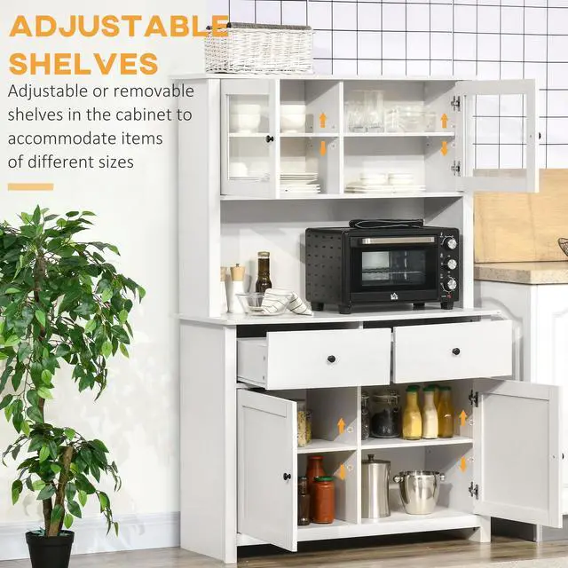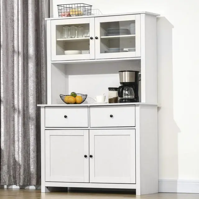 Upgrade Your Storage: The multilayer shelves of this kitchen hutch give you plenty of room for dishes, cookbooks, pots and pans, dry goods while the two drawers allow you to put away napkins, towels, and silverware. The open middle space can hold kitchen appliances such as a microwave or coffee maker. If you have taller items, adjustable shelves can be customized to fit things like pitchers, pasta containers, and blenders. Cable management cleans your desk space and maintains a safe counter.