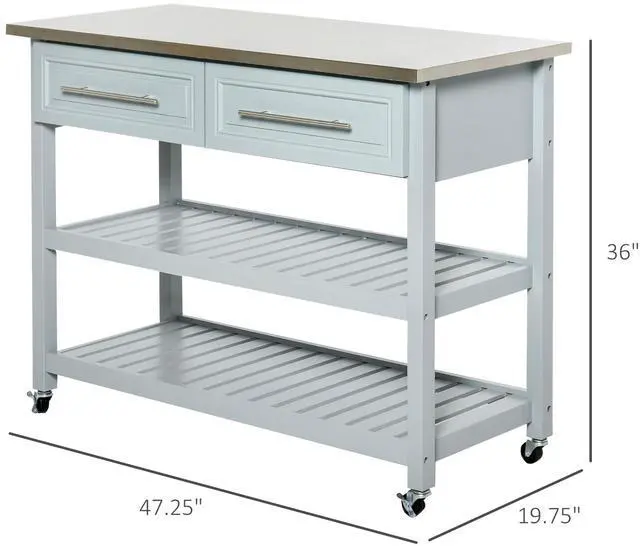Your Home: This 3-tier rolling kitchen island is built in a rustic farmhouse style with beautiful white pine and engineered wood, a stylish stainless steel top, 4 smooth casters, and ample storage and shelving.