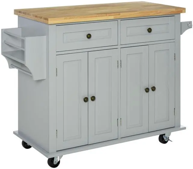 • Kitchen Island on Wheels, Rolling Cart with Rubberwood Top, Spice Rack, Towel Rack and Drawers for Dining Room, Grey