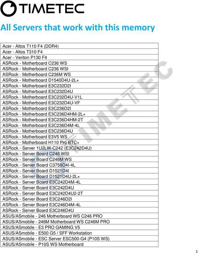 Package: 1x8GB A must For Server, Not For Desktop/Laptop For Selected Acer, ASRock, ASUS/ASmobile, BCM, Dell, DFI, Fujitsu, Gigabyte, HP/Compaq, Intel, Lenovo, MSI, NEC, Quanta, Supermicro, Synology Guaranteed – Lifetime warranty from Purchase Date Free technical support (support@timetecinc. com) MON - FRI 9AM-6PM PST