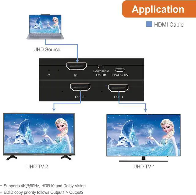 The JTECH-4KSP2 1 x 2 HDMI splitter is a Multi-Resolution Output HDMI scaler switcher that can support various UHD resolutions. This 1 x 2 HDMI splitter is perfect for users that are in the process of upgrading their entertainment centers and need a device that supports 4K and 1080p resolutions, allowing them to integrate newer, more advanced displays without having to replace their older model displays.NOTE: The MRO series splitters do not downscale to 720P. They do not change the scan type (Progressive vs Interlaced) and they do not downscale HDR Metadata (HDR/HDR10/DolbyVision)