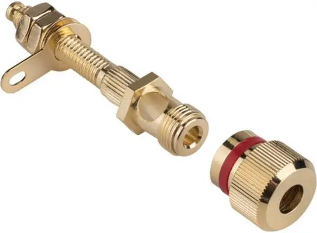 The Dayton Audio BPA-38G heavy-duty binding posts were designed with the audiophile in mind. Quality, 24kt. gold plating assures the highest possible signal transfer and resists harsh environmental conditions that cause performance-robbing corrosion. The BPA-38G binding posts can be used with banana plugs or will accept wire up to 8 gauge, and large diameter knurled heads allow positive finger-tight connections.